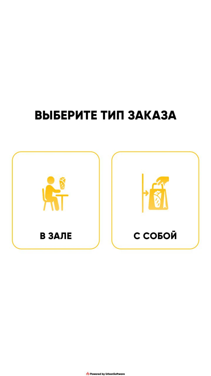 - Клиент выбирает тип заказа — в зале или с собой.